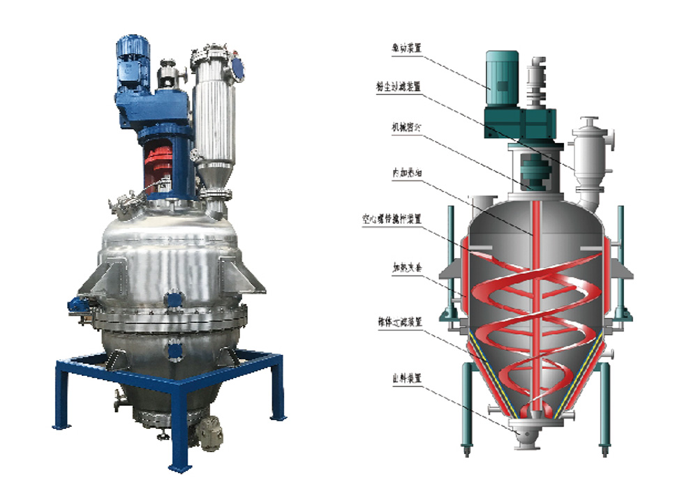 本機為簡錐式結構,在圓筒體和下部錐體上設置有加熱夾套,可對物料進行加熱或冷卻,在設備內部設置有空心軸和變角度變導程空心螺旋攪拌裝置攪拌,對物料進行攪拌和提升,在出料時推出物料。在下部錐體內設置有圓錐形過濾裝置,在設備底部設置特殊結構無死角氣動出料閥門。